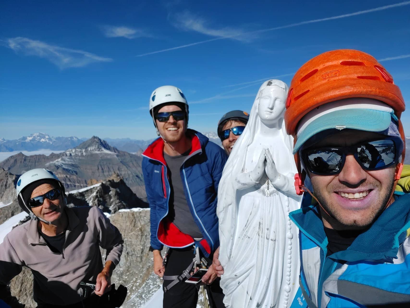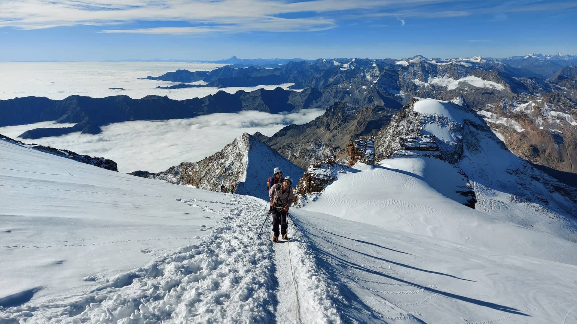 Environ 50 mètres sous le sommet, nous quittons le glacier pour une courte partie plus minérale pour atteindre par quelques pas d'escalade aériens le sommet du Grand Paradis (4061m).