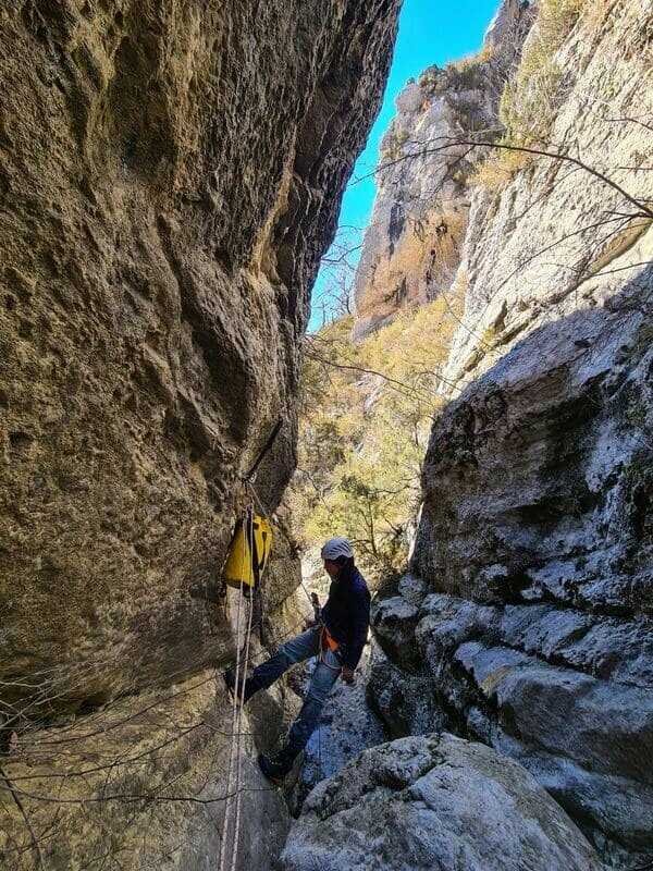 En canyon sec, pas besoin de combinaison néoprène : un casque, un baudrier et des cordes suffisent.
