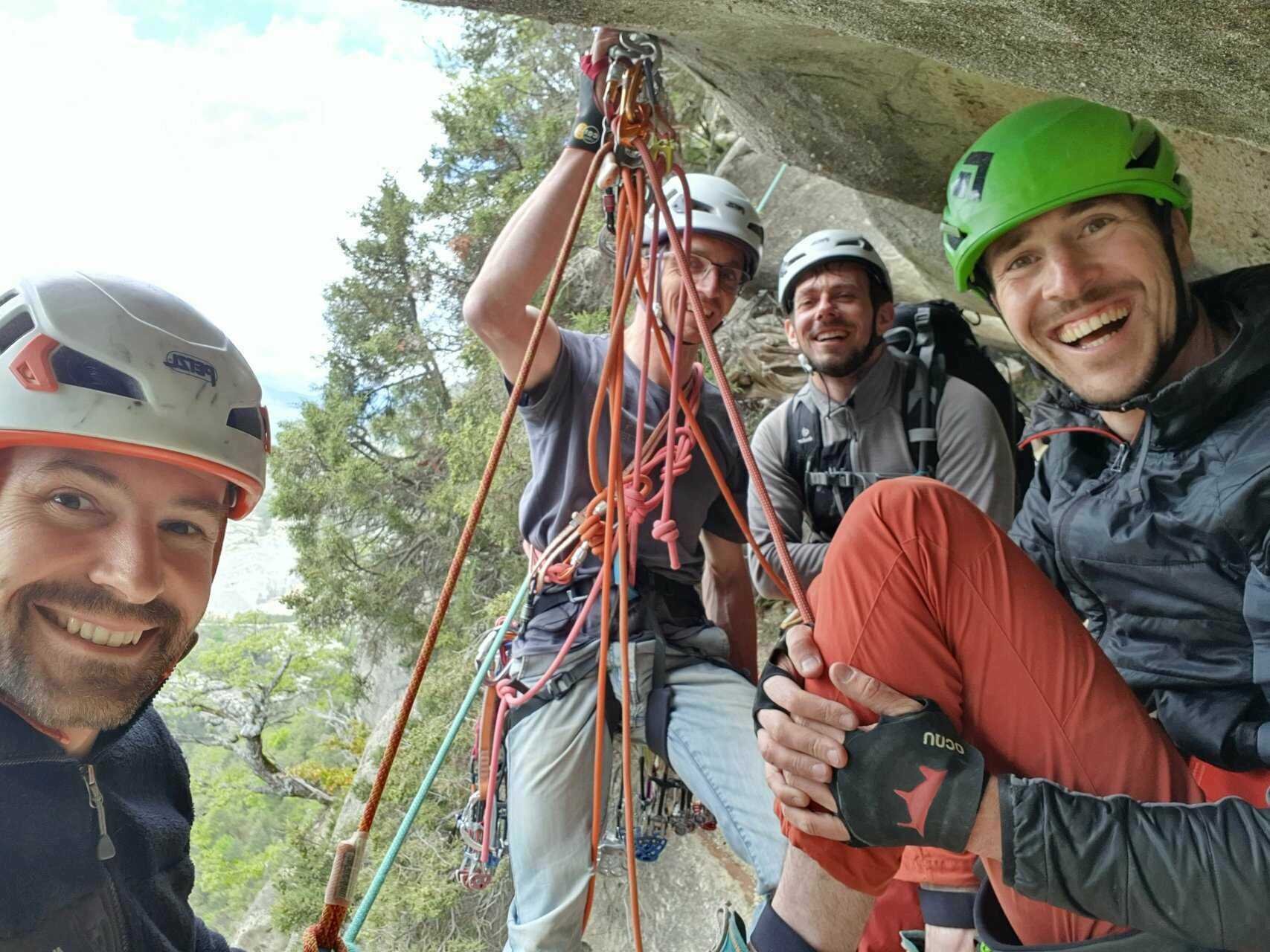 - Descente : selon le sommet, retour par un sentier ou première expérience de descente en rappel pour retrouver le pied de la voie.