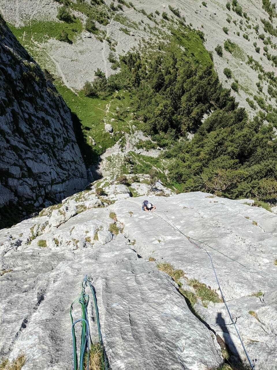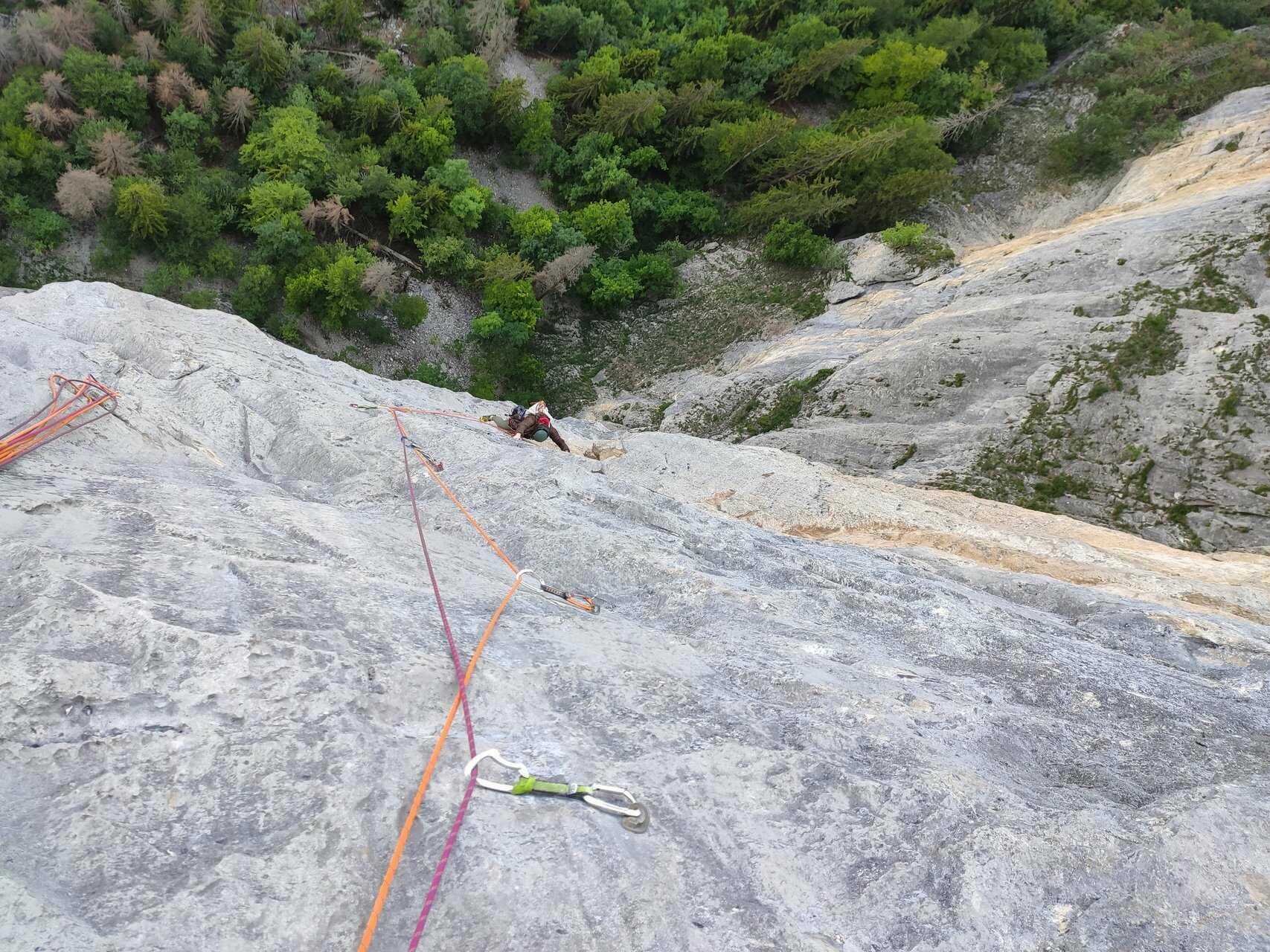 - Briefing « spécial grande voie » : présentation du matériel spécifique (corde à double, longes), organisation de la cordée et communication en paroi.