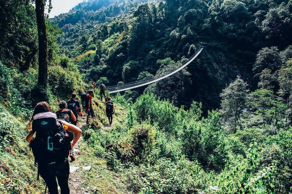 Le sentier passe par une forêt peuplée de bouleaux, de rhododendrons géants, de chênes de montagne et d’érables, puis à travers la jungle, avant d’atteindre le sommet d’une crête. Sur le chemin nous pouvons apercevoir l’Annapurna Sud.